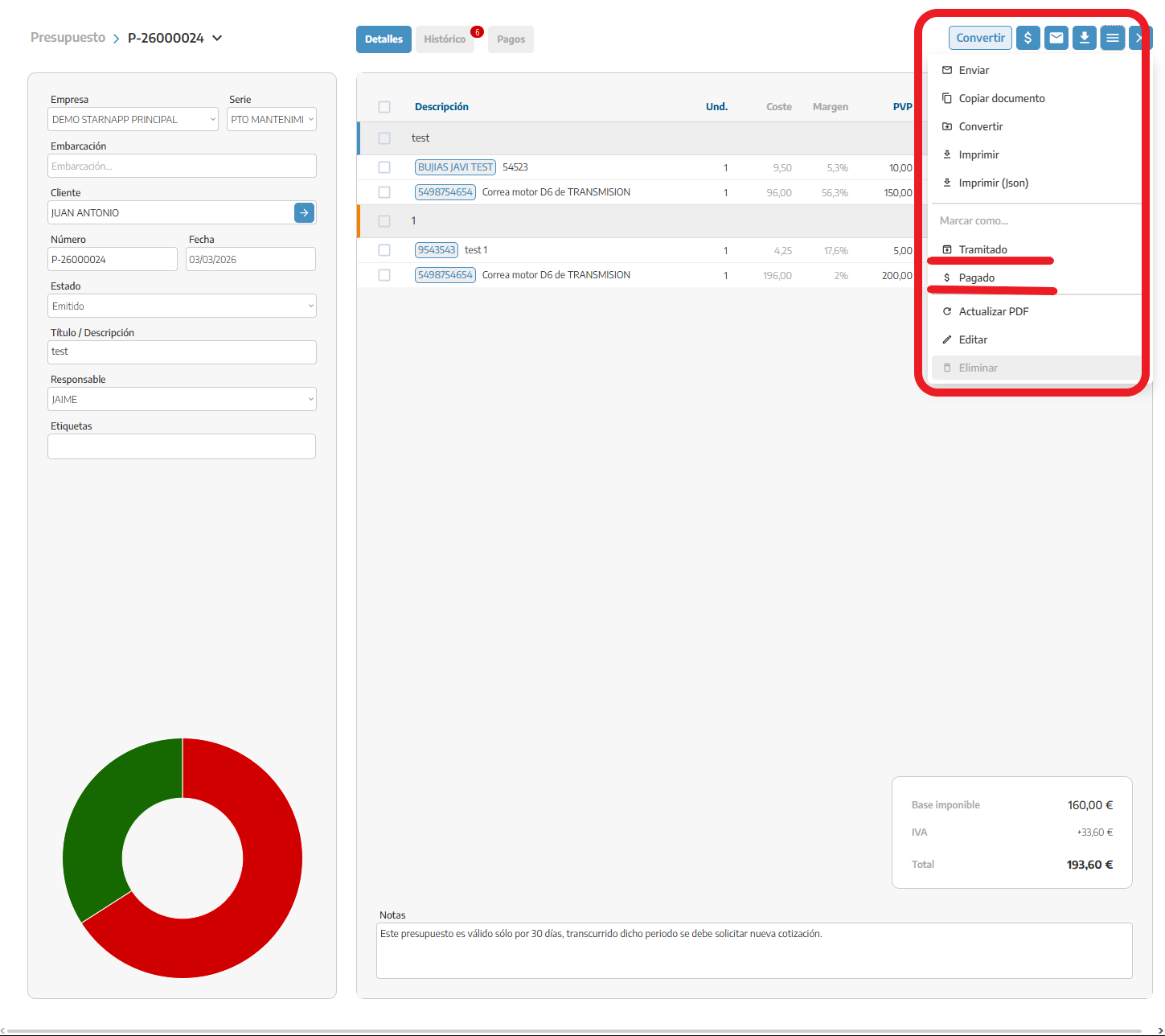 In our document, once it’s issued, we can mark it with the different statuses: paid, processed, sent. To do that, we’ll go to the menu at the top, next to the convert button.