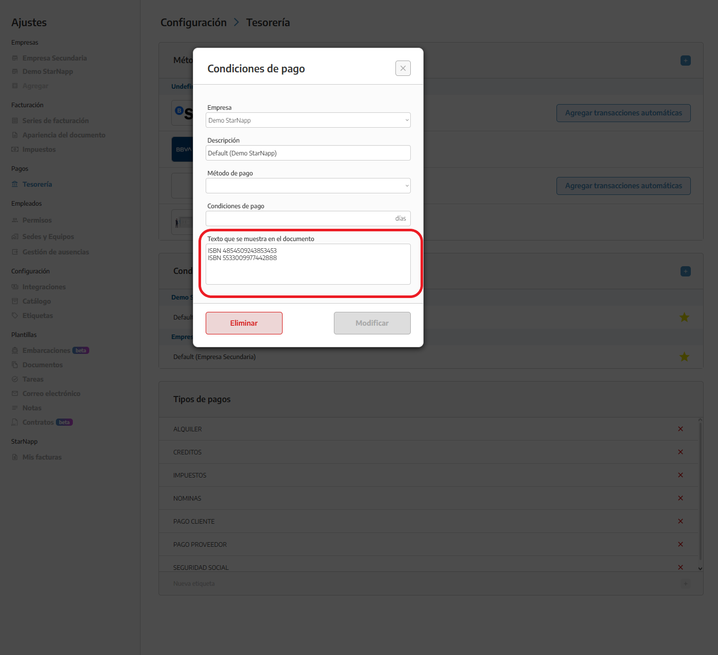 Puedes definir tus condiciones estándar en dicha configuración. Como ves en el último cuadro puedes definir exactamente lo que se verá reflejado en el documento PDF.