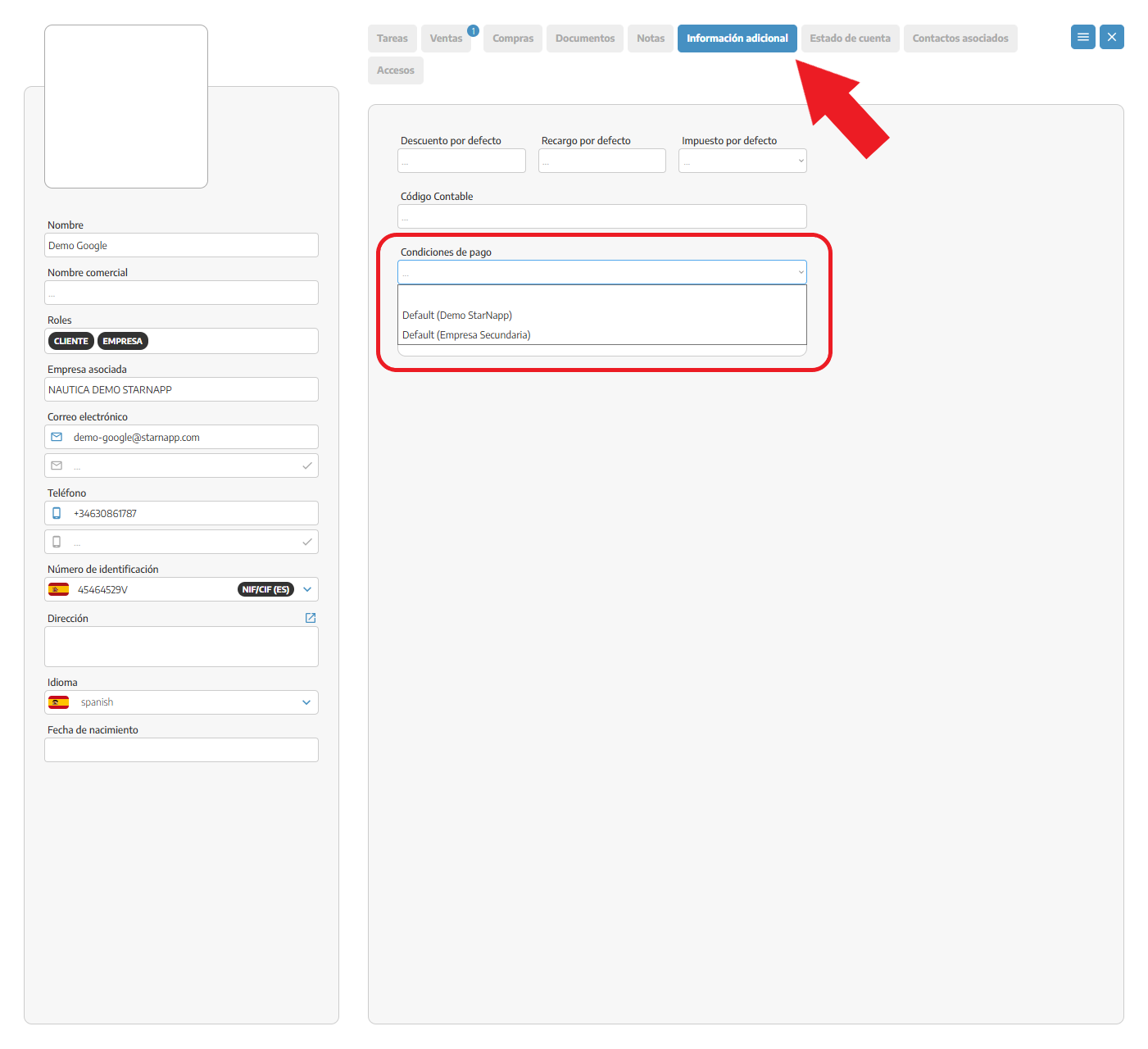 Puedes aplicar automáticamente estas condiciones predeterminadas a los nuevos clientes desde el perfil del cliente en la pestaña de información adicional.