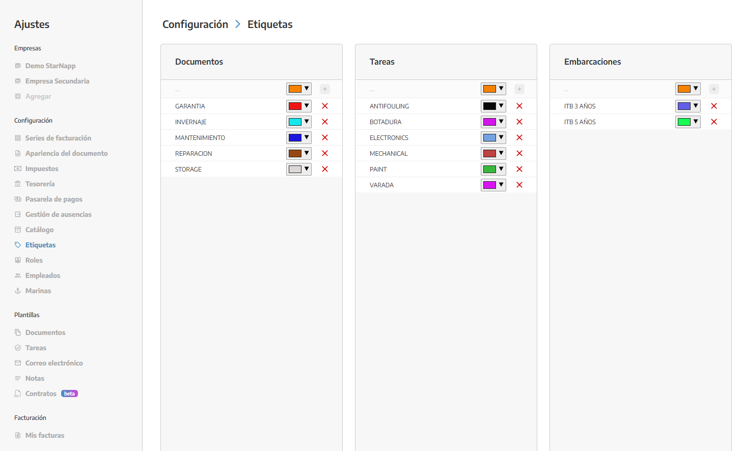 En la pestaña de ETIQUETAS disponemos de tres vistas para la configuración de nuestras etiquetas, tanto para documentos, tareas y para embarcaciones. Todas estas personalizables a nuestro gusto y pudiendo crear tantas como queramos.
